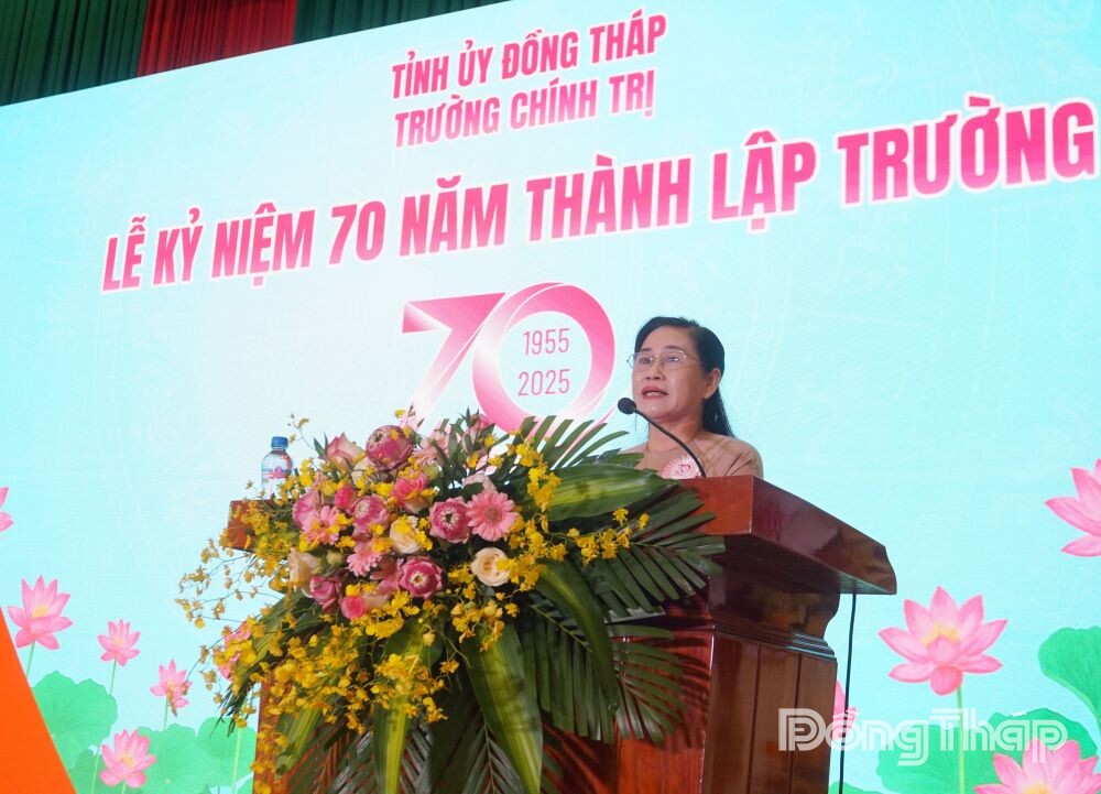 Phát biểu tại buổi lễ, đồng chí Châu Thị Mỹ Phương ghi nhận và đánh giá cao những nỗ lực, đóng góp quan trọng của tập thể nhà trường trong thời gian qua. Đồng chí nhấn mạnh, trước yêu cầu của tình hình mới, nhà trường cần tiếp tục phát huy truyền thống đoàn kết, giữ vững bản sắc văn hóa Trường Đảng; không ngừng nâng cao chất lượng đào tạo, bồi dưỡng nhằm xây dựng đội ngũ cán bộ Đất Sen Hồng “vừa hồng, vừa chuyên”.