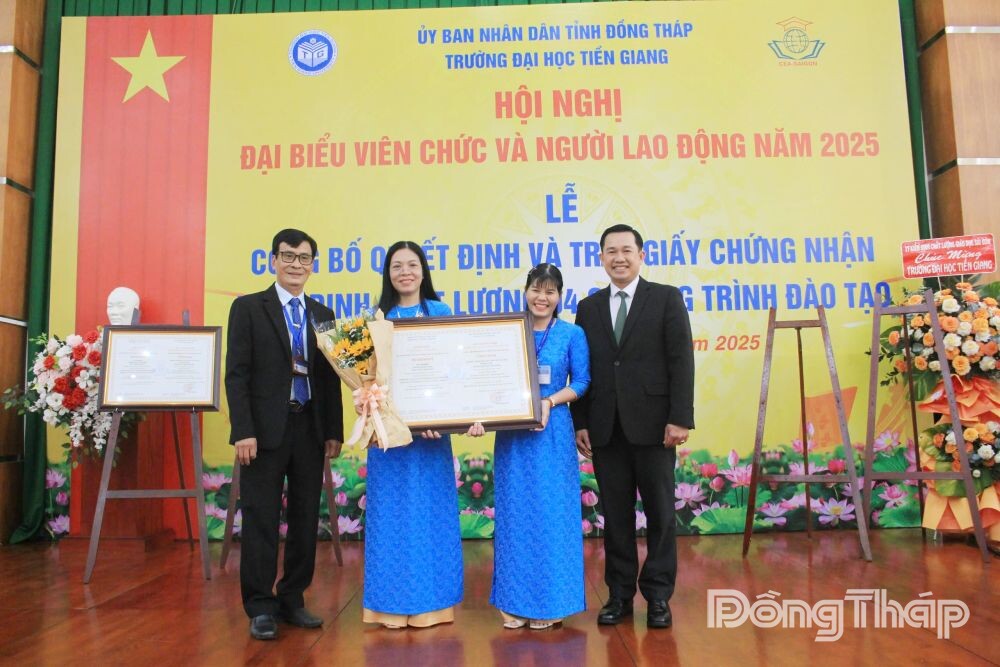 Phát biểu tại buổi lễ, đại diện Trung tâm Kiểm định chất lượng giáo dục Sài Gòn ghi nhận và đánh giá cao tinh thần nghiêm túc, trách nhiệm của Trường Đại học Tiền Giang trong công tác tự đánh giá, cải tiến chất lượng chương trình đào tạo; đồng thời bày tỏ tin tưởng nhà trường sẽ tiếp tục duy trì, phát huy kết quả đạt được, góp phần nâng cao chất lượng giáo dục đại học.